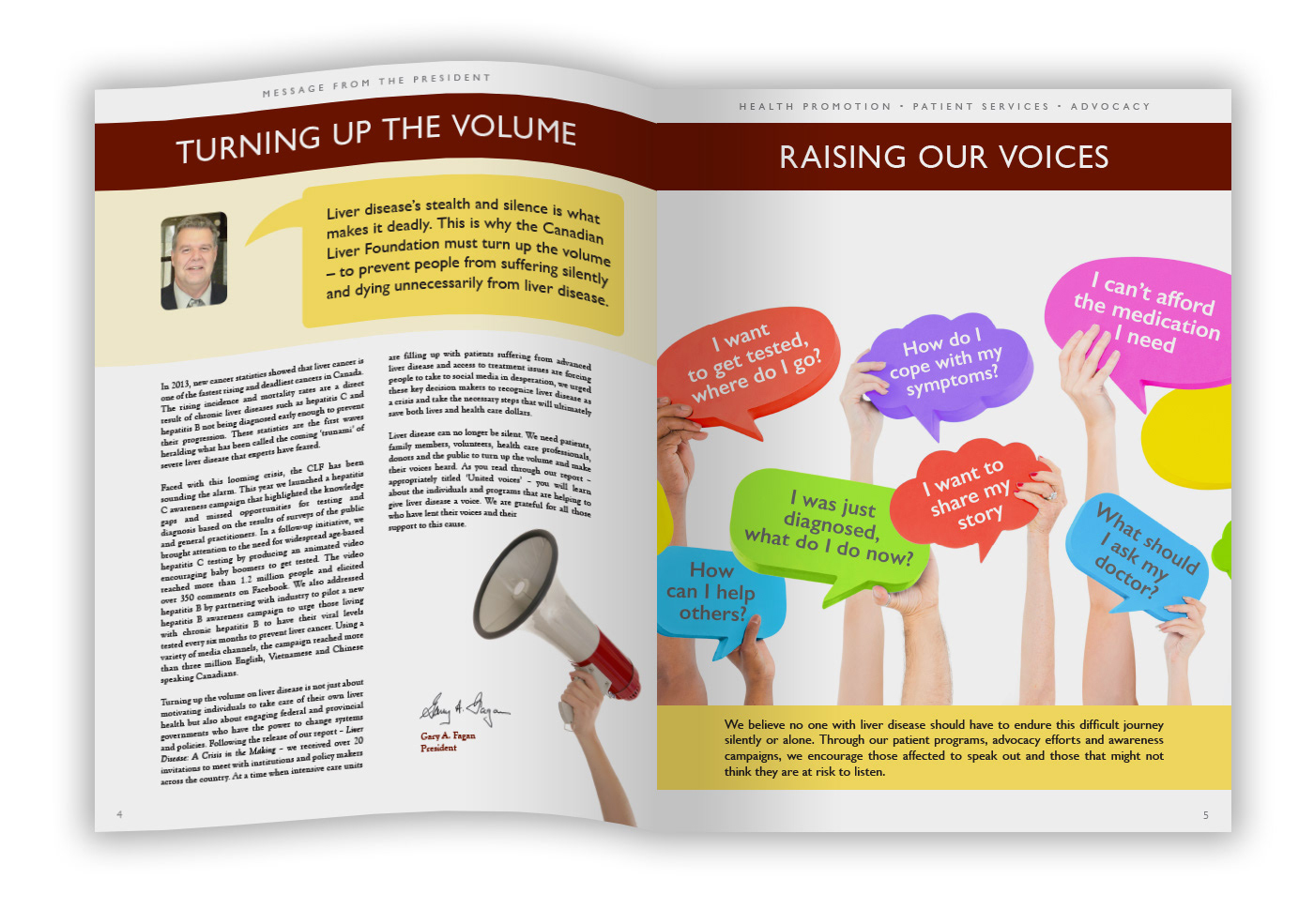 This annual report for the Canadian Liver Foundation (CLF) begins to integrate their new branding standards to help the organization move the updated standards that would be implemented in the year to come. Overall the report had a bright and positive "speech bubble" theme to show the represenation of the CLF's involvement from not only people who are suffering from liver diseases, but also from the researchers working to find cures and to provide treatment.