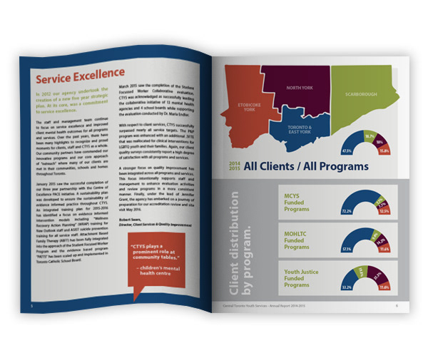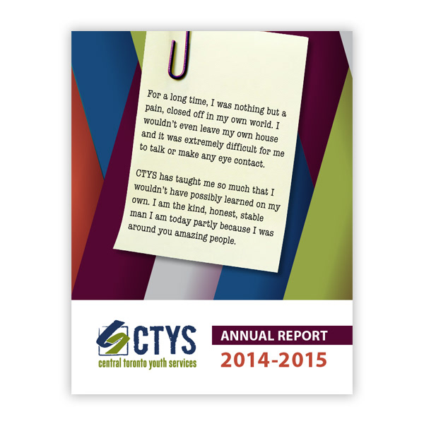 This annual report for Central Toronto Youth Services (CTYS) is in a booklet format with a large focus on graphic and visual representation of the financial and statistical accomplishments of the organization from the past year.